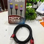 Ce câble HDMI de la marque « HDTV PREMIUM » est conçu pour une transmission haute vitesse et compatible avec les résolutions 4K Ultra HD. Il est de 3 mètres de longueur et se présente avec un câble noir et des connecteurs rouges distinctifs.